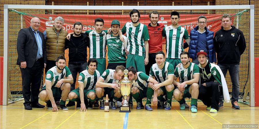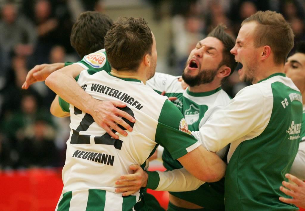 Das war überraschend, doch unverdient war es nicht: Der FC Winterlingen hat die 20. Ausgabe des Sparkassen-Indoor-Cups gewonnen. Im Endspiel des Hauptturniers setzte sich der Bezirksligist am Sonntag mit 7:6 nach Neunmeterschießen gegen den Verbandsligisten FC Singen durch. Nach der regulären Spielzeit hatte es 1:1 gestanden. Zum Matchwinner avancierte Dominik Kosic. Der Winterlinger Keeper war nicht nur zwischen den Pfosten eine Bank, er steuerte mit seinen Fernschüssen auch noch zwei Turniertreffer bei. Und insbesondere der zweite, der zum 2:2-Ausgleich führte und die Winterlinger ins Neunmeterschießen des Finales brachte, war ein wichtiger. Trainer „Polchi“ Sidiropoulous schloss bei seinem Lob keinen Mann aus. Seine Truppe sei